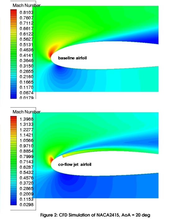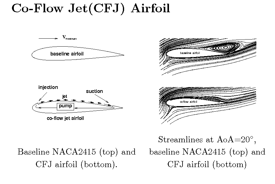 In the CFJ airfoil, a high energy jet is injected tangentially on the suction surface near the leading edge and the same amount of mass flow is sucked in near the trailing edge, as shown in the following figures. The turbulent shear layer between the main flow and the jet causes a strong turbulence diffusion and mixing, which enhances the lateral transport of energy and allows the main flow to overcome the severe adverse pressure gradient and stay attached at high angles (AOA). The airfoil always achieves a significantly higher lift due to the augmented circulation. The operating range of AOA, hence the stall margin, is significantly increased. The energized main flow fills the wake deficit and dramatically reduce the airfoil drag, or generates thrust (negative drag) (see Figure 3). CFJ airfoil is to achieve 3 goals: high effectiveness, energy efficient, easy implementation